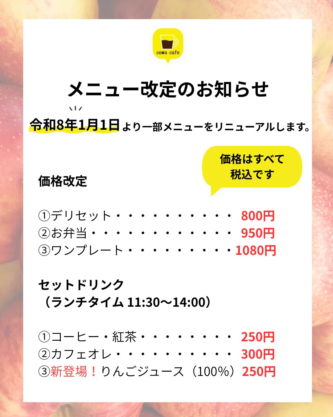 このたび、令和8年1月1日より、メニュー内容および一部商品の価格を見直しさせていただくこととなりました。
